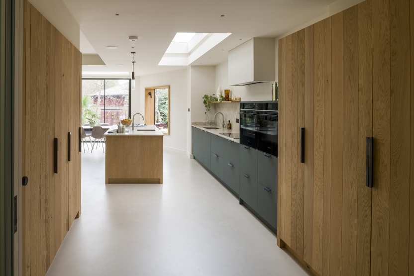 Im Sinne des Gleichgewichts zwischen handwerklichem Können, natürlicher Schönheit und zeitgenössischem Design, das das ganze Haus prägt, wurde für die Küchenschränke FENIX® Verde Comodoro gewählt. Das tiefe Grün des Materials bildet einen reizvollen Kontrast zu dem Eichenfurnier, das die Kücheninsel dominiert. Eine natürliche Farbpalette umgibt den offen gestalteten Raum und ergänzt das tropische Grün, das durch die Glasfenster zu sehen ist. Der ursprünglich dunkle, nach Norden ausgerichtete Raum, ist jetzt eine warme, lichtdurchflutete Wohnküche. Inglis Hall erzählt uns mehr über dieses ehrgeizige Projekt.