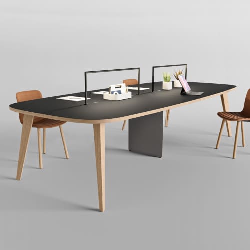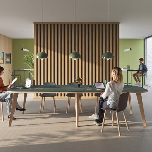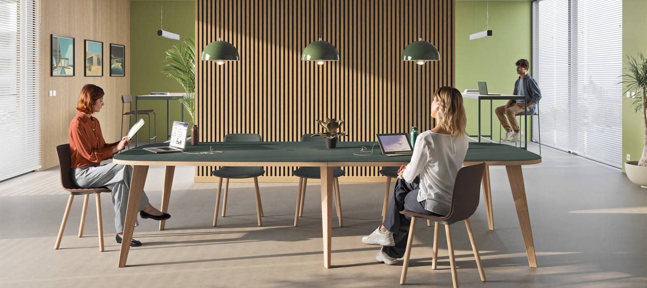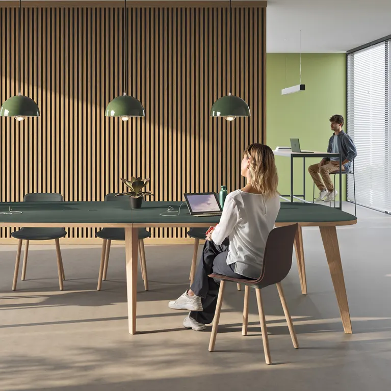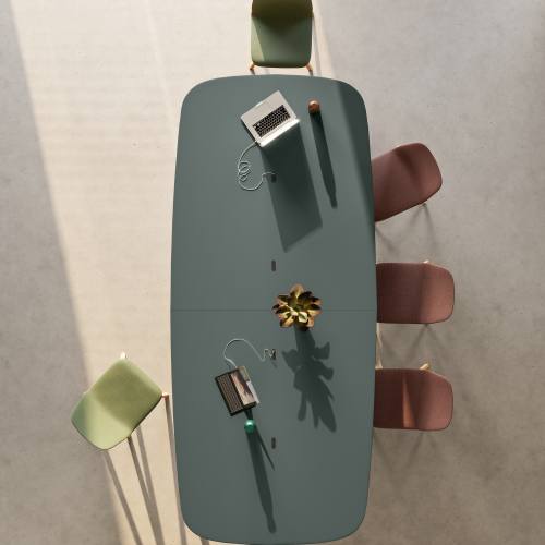 De Pigreco-collectie is ontworpen om verder te gaan dan de tweedeling van creativiteit vs. formaliteit. De trapeziumvormige werkbladen verbeteren bijvoorbeeld visuele ergonomie en bevorderen een natuurlijke positie gericht naar het midden, waardoor ze ideaal zijn voor zowel informele brainstorm-sessies als meer gestructureerde vergaderingen. In die zin is Pigreco een ongelooflijk veelzijdig systeem: het past perfect in zowel innovatieve co-working spaces als in vergaderruimtes die een balans vereisen tussen aanwezigheid en efficiëntie.